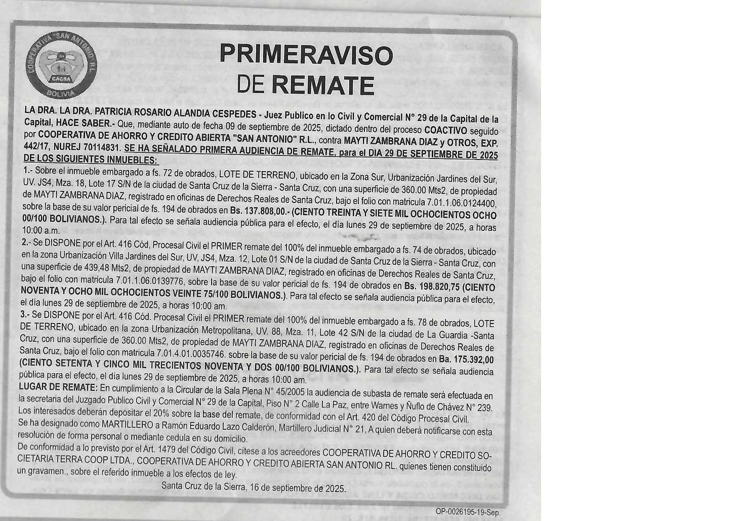 AVISO DE REMATE DE TRES LOTES EN LA CIUDAD DE SANTA CRUZ