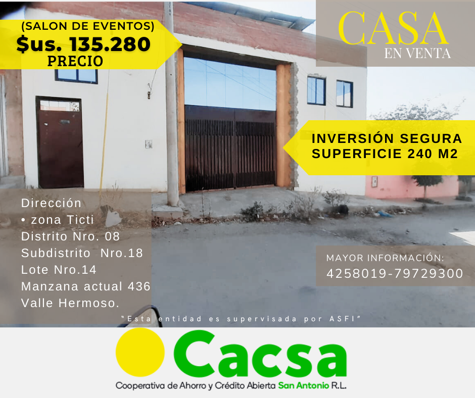 INMUEBLE, CASA CON UNA SUPERFICIE DE 295,00 MTS2., SIGNADO CON EL LOTE No. 19, MANZANA No. 49, UV. 278, INSCRITO EN LAS OFICINAS DE DERECHOS REALES BAJO LA MATRICULA N.º 7.01.2.01.0045764, UBICADO EN LA ZONA ESTE, URB. TUPA RUETE.